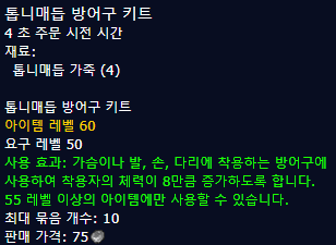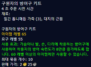 | 1~45 | 작은 방어구 키트 | 얇은가죽(1) - 재료를 경매장에서 구입시 작은 방어구키트 제작. |