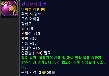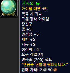 또한 연금술 변환에 필요했던 "연금술사의 돌"은  " 현자의 돌 "로 바뀌며  더 상위 버전인 " 연금술사의 돌 " 이 있는데요. 장신구로 되어 있어서 착용이 가능합니다.  옵션은 아래 스샷 참고 하세요.