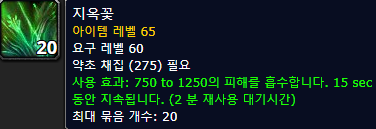 ![]() 초반에는 약초채집 275 요구조건이 없었지만, 2.3 패치때 약초채집 요구조건이 생겼다고 합니다. 지옥꽃은 지옥풀 약초채집시 랜덤하게 같이 나옵니다. |