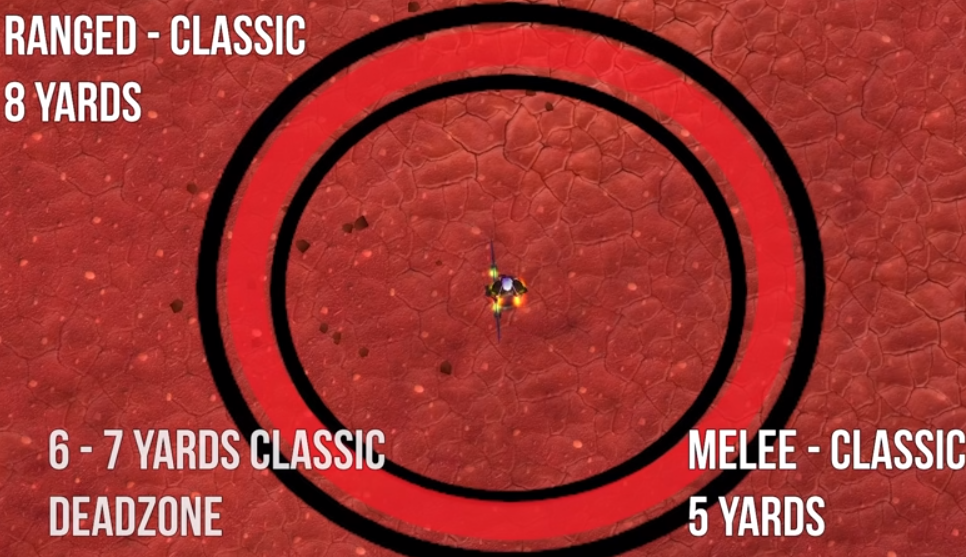 1) 데드존 없어짐 : 사냥꾼의 원거리 공격 가능 최소 사거리는 클래식에서 8야드(약7.32 미터) 였습니다. 밀리 근접공격은 5야드(약 4.58미터)이내 부터 가능합니다. 따라서 사냥꾼은 몹이 8야드와 5야드 사이의 거리에 있으면 원거리 공격도 안되고 근거리공격도 안되는 아주 취약한 점이 있었죠. 이 구간이 데드존입니다.