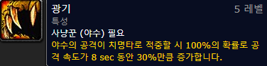 - 야성의 감응 : 야수의 공격이 치명타로 적중하면 10초 동안 모든 파티원의 공격력이 3%만큼 증가합니다. (특성)
