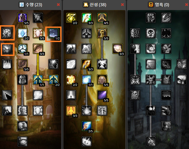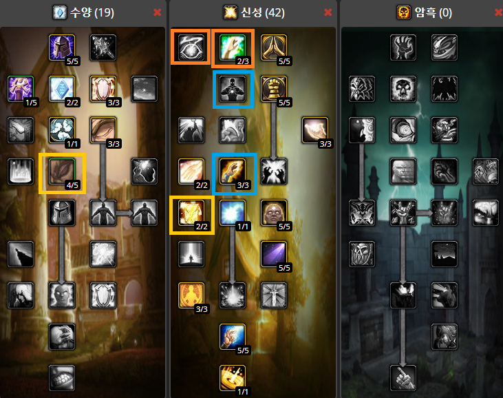 1. 천상의 정신을 연마한 신성사제 특성입니다. 주황색 네모칸 부분은 선택적으로 변경될수 있습니다.