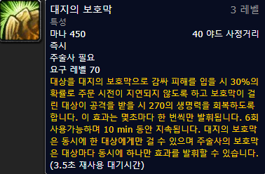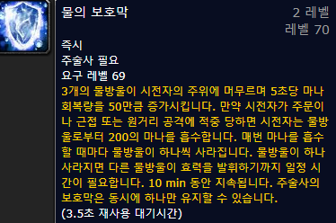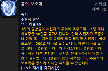 : 물의 보호막 항상 유지 . 대지의 보호막은 탱커나 정술 암사 조드에 사용합니다. (주문시전지연 방지 때문)