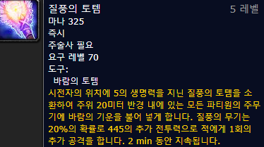 질풍의 무기: 주술사의 무기에 바람의 기운을 부여합니다. 매 공격 시 20%의 확률로 전투력이 445만큼 증가한 상태로 2회 추가 공격 했을 때와 동일한 피해를 입힙니다. 30분 동안 지속됩니다.