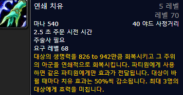 연쇄 치유가 메인힐스킬입니다. 마나가 부족할때 5레벨 연치대신에 4레벨을 사용하면 좋습니다. 마나소모는 19%줄어들지만, 치유량은 10%만 줄어듭니다.