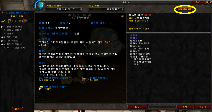 아틀라스는 던전별 지도를 보여주고 우두머리 위치를 표시해주는 애드온인데요. 아틀라스 퀘스트와 함께 사용하시면 던전별 퀘스트도 정리해서 보여줍니다. 오른쪽에 있는 버튼을 누르시면 퀘스트 목록을 볼수 있구요. 퀘스트명을 클릭하시면 자세한 퀘스트 정보를 보여줍니다.