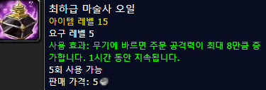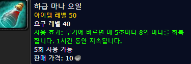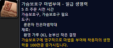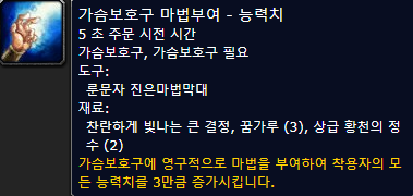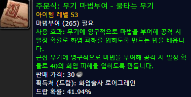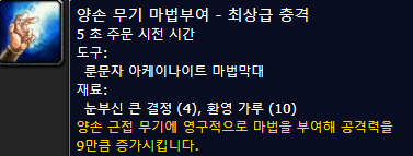 : 블러드엘프 성기사의 경우는 21레벨까지는 불타는 무기를 사용하고, 그 이후(지휘의 문장 배운이후)에는 양손 무기 공격력 +9를 마부하는게 좋습니다.