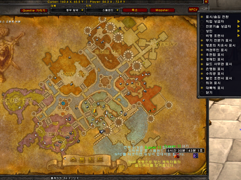 # 퀘스티 (Questie) " : 모르는 사람이 없는 퀘스트 도우미 애드온. 지도에 퀘스트 수행지역과 위치등을 표시해줌.