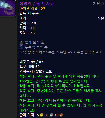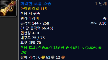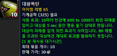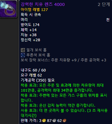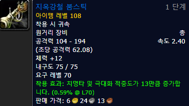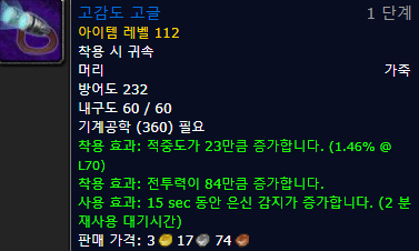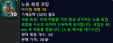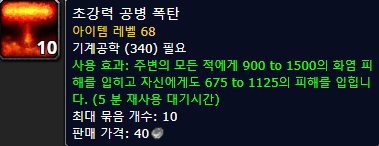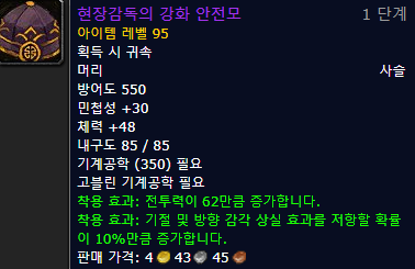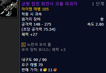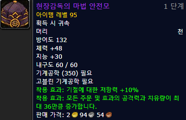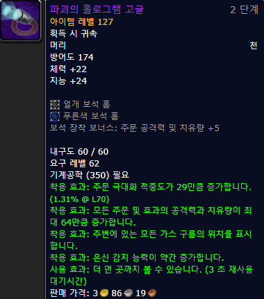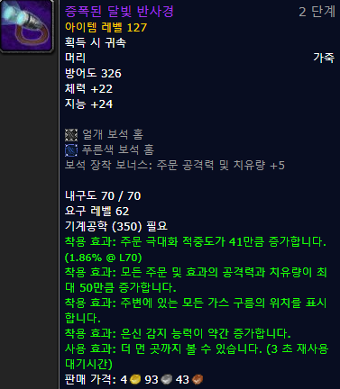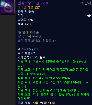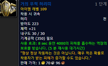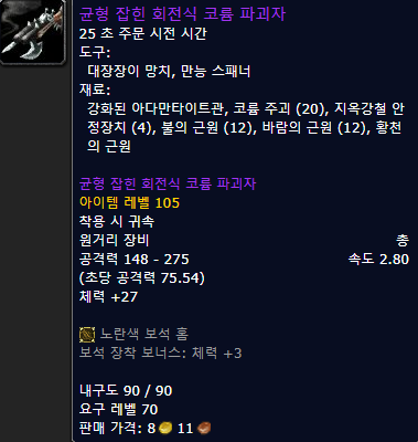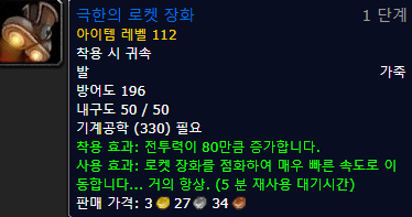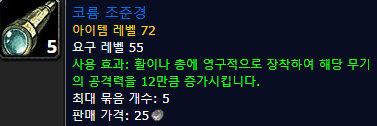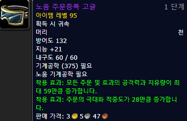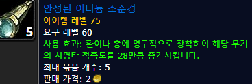 일격보증 고글 v2.0![]() 재료: 질긴 톱니매듭 가죽(6) 코륨 동력핵(1) 강화된 아다만타이트관(2) 지옥강철 안정장치(4) 황천의 근원(1) 야안석(2) |