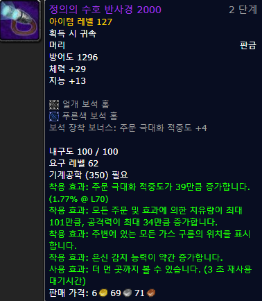 정의의 수호 반사경 2000![]() 재료: 질긴 톱니매듭 가죽(6) 코륨 동력핵(1) 강화된 아다만타이트관(2) 지옥강철 안정장치(4) 황천의 근원(1) 여명석(2) |