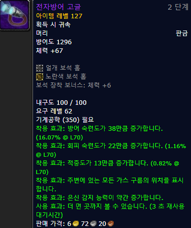 전자방어 고글![]() 재료: 질긴 톱니매듭 가죽(6) 코륨 동력핵(1) 강화된 아다만타이트관(2) 지옥강철 안정장치(4) 황천의 근원(1) 탈라사이트(2) |