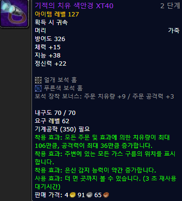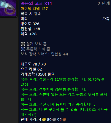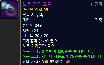 죽음의 고글 X11![]() 재료: 질긴 톱니매듭 가죽(6) 코륨 동력핵(1) 강화된 아다만타이트관(2) 지옥강철 안정장치(4) 황천의 근원(1) 생명의 루비(2) |