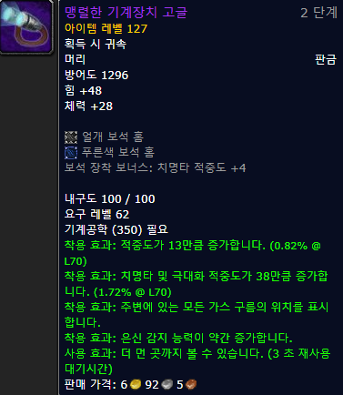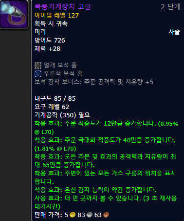 폭풍기계장치 고글![]() 재료: 질긴 톱니매듭 가죽(6) 코륨 동력핵(1) 강화된 아다만타이트관(2) 지옥강철 안정장치(4) 황천의 근원(1) 생명의 루비(2) |