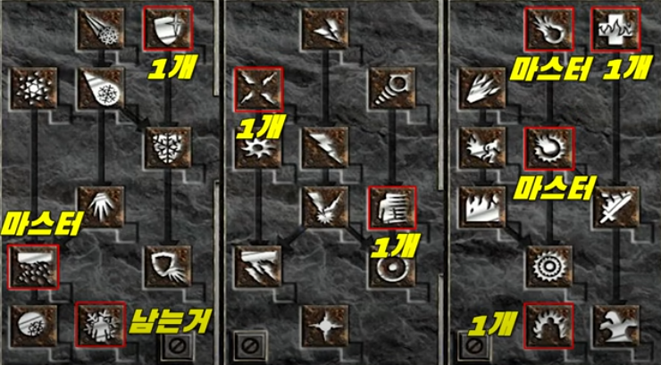 스킬: 아이스볼트(얼음살), 아이스블래스트(얼음작렬) 한개씩 찍고 나머지는 파이어볼(화염구)을 찍어줍니다.