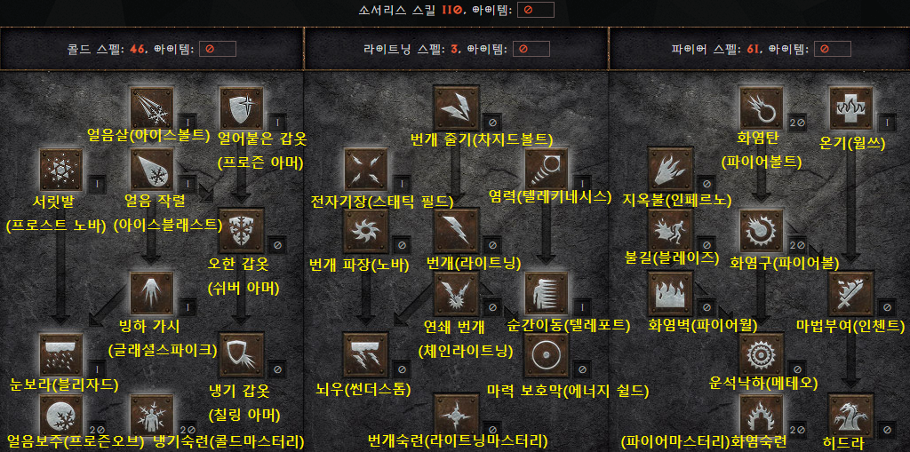 스킬초기화를 하고, 1원소 블리자드 소서리스로 바꿔줍니다.