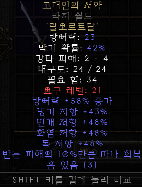 고대인의 서약(Ancient's Pledge) 21랩제 ![]() 50% 방어 상승 콜드 저항력 +43% 라이트닝 저항혁 +48% 파이어 저항력 +48% 포이즌 저항력 +48% 10% 데미지 마나로 흡수 재료: 3소켓 방패+랄+오르트+탈 |