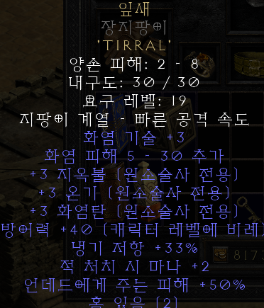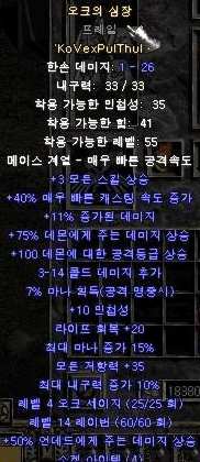 통찰력 (27랩제) ![]() 장착시 레벨 12~17 메디테이션 오라의 효과 적용 (변함) +35% 매우 빠른 캐스팅 속도 +200~260% 증가된 데미지 (변함) +9 최소 데미지 +180~250% 추가 공격 등급 (증가) +5~30 파이어 데미지 +75 포이즌 데미지 (5초간) +1~6 크리티컬 스트라이크 (변함) +5 모든 능력치 +2 몬스터를 죽일 때마다 마나를 얻음 +23% 매직 아이템을 얻을 확률 재료: 4소켓 폴암+랄+티르+탈+솔 |