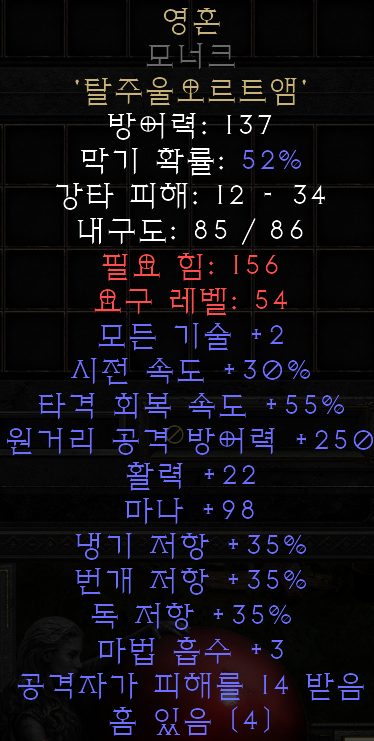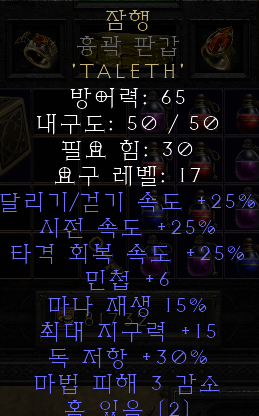 제왕운시(Rhyme) (29렙제) ![]() 40% 블럭속도 증가 모든 저항력 +25% 마나 재생 15% 결빙되지 않음 50% 몬스터로 부터 얻는 골드 증가 25% 매직 찬스 증가 재료: 2소켓 방패+샤에+에드(에스) |