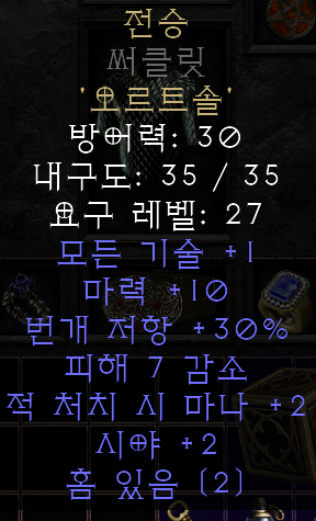 학식(Lore) (27레벨요구)![]() 1 모든 스킬레벨 상승 +10 에너지 적 제거시 +2 마나 획득 라이트닝 저항력 +30% 데미지 감소 7 +2 시야 증가 재료: 2소켓 투구+오르트+솔 |