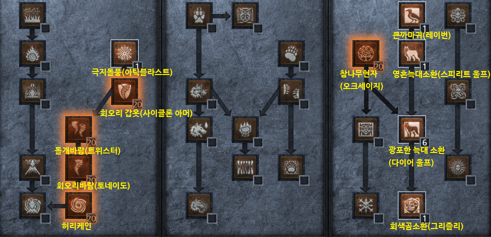 스킬: 오크세이지(참나무현자)1개 / 허리케인(싹쓸바람)을 찍을 수 있는 만큼 찍고 / 그 다음 토네이도(회오리바람)를 찍을 수 있는 만큼 찍고 / 나머지는 모두 사이클론 아머(회오리 갑옷)을 찍어줍니다.