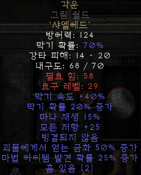 제왕운시(Rhyme) (29렙제) ![]() 40% 블럭속도 증가 모든 저항력 +25% 마나 재생 15% 결빙되지 않음 50% 몬스터로 부터 얻는 골드 증가 25% 매직 찬스 증가 재료: 2소켓 방패+샤에+에드(에스) |