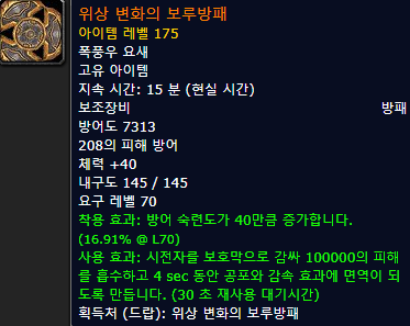 위상 변화의 보루방패![]() 착용 클래스: 탱전/보기 (생귀나르의 공포와 캘타스의 불덩이 작열을 보호막으로 막을수 있다) |