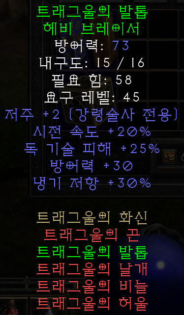 트랑울의 클러스 헤비브레이서 ![]() 방어력: 67 - 74 내구도: 18 요구 힘: 58 요구 레벨: 45 저주 기술 +2 (강령술사 전용) 시전 속도 +20% 방어력 +30 냉기 저항 +30% 독 기술 피해 +25% 증가 |