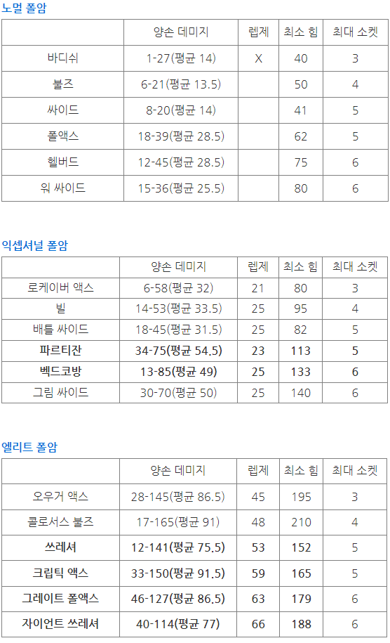 - 재료: 4소켓 미늘창 / 지팡이 / 활 / 쇠뇌 (활과 쇠뇌는 2.4 패치에 추가)