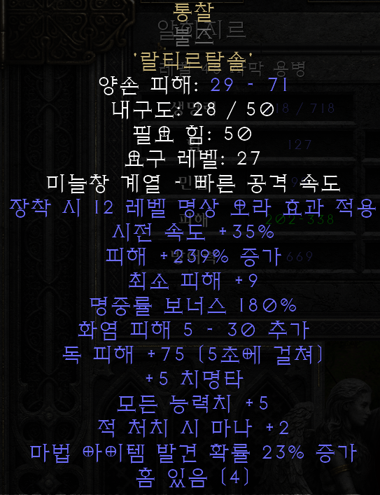 통찰력 장착 시 12~17레벨의 메디테이션 오라 효과 적용(변동) +35% 매우 빠른 캐스팅 속도 증가 +200~260% 증가된 데미지(변동) +9 최소 데미지 180~250% 공격 등급 추가 상승(변동) 5-30 파이어 데미지 추가 매 초당 +75 포이즌 데미지 추가 +1~6 크리티컬 스트라이크(변동) +5 모든 능력치 +2 마나 상승(적 제거 시) 23% 매직 아이템 얻을 확률 증가 변동 옵션이 4가지임. |