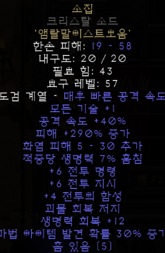 요구레벨: 57 모든 기술 +1 공격 속도 +40% 피해 +250~290% 증가(변동) 화염 피해 5 - 30 추가 적중당 생명력 7% 훔침 +2~6 전투 명령(변동) +1~6 전투 지시(변동) +1~4 전투의 함성(변동) 괴물 회복 저지 생명력 회복 +12 마법 아이템 발견 확률 30% 증가 |