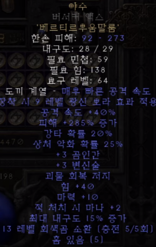 - 옵션이 매우 훌륭하고, 9레벨 광신 오라 효과(공격속도+적중+피해증가)가 매우 좋음.