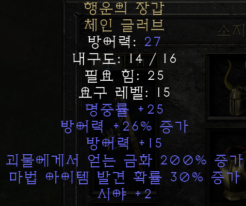 챈스 가드 체인 글러브 (행운의 장갑) ![]() 방어력: 27 - 28 내구도: 16 필요 힘: 25 요구 레벨: 15 명중률 +25 방어력 +20~30% 증가(변동) 방어력 +15 괴물에게서 얻는 금화 200% 증가 마법 아이템 발견 확률 25~40% 증가(변동) 시야 +2 |