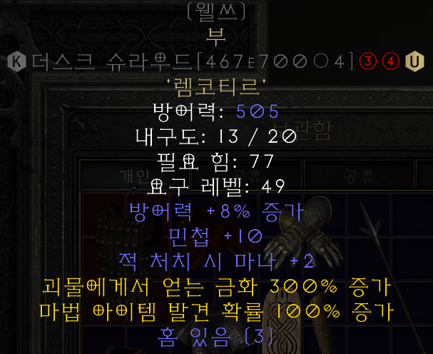 - 방어도 좋은 갑옷에 작업해서 수수께끼 전까지 사용할만 하다. ( 같은 3소켓이 재료라서 큐빙으로 룬만지우고 갑옷은 그대로 쓸수도 있다.)