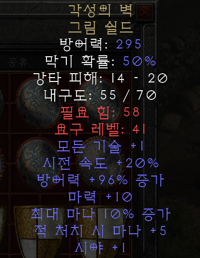 각성의 벽 (리드리스 월) 그림 쉴드 ![]() 방어력: 271~347 (변함) 막기 확률 성기사: 50% 야만용사/아마존/암살사: 45% 드루이드/강령술사/원소술사: 40% 성기사 강타 피해: 14 - 20 내구도: 70 필요 힘: 58 요구 레벨: 41 모든 기술 +1 시전 속도 +20% 방어력 +80~130% 증가(변함) 마력 +10 최대 마나 10% 증가 적 처치 시 마나 +3~5(변함) 시야 +1 |