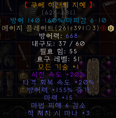 쿠에 히간의 지혜 메이지 플레이트 ![]() 방어력: 628~681 내구도: 60 필요 힘: 55 요구 레벨: 51 모든 기술 +1 시전 속도 +20% 타격 회복 속도 +20% 방어력 +140~160% 증가(변동) 마력 +15 마법 피해 6~10 감소(변동) 적 처치 시 마나 +3 |