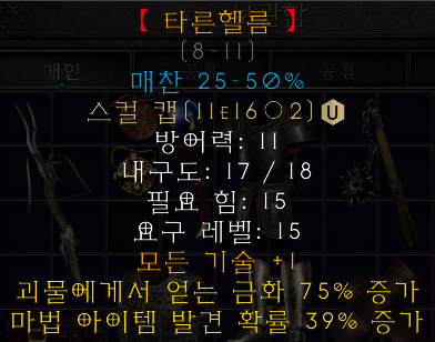 타른헬름 스컬 캡 ![]() 방어력: 8~11 내구도: 18 필요 힘: 15 요구 레벨: 15 모든 기술 +1 괴물에게서 얻는 금화 75% 증가 마법 아이템 발견 확률 25~50% 증가(변동) |