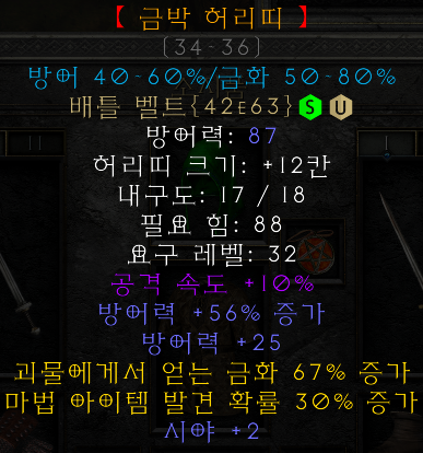 금박 허리띠 헤비 벨트 ![]() 방어력: 34 - 36 허리띠 크기: +8칸 내구도: 18 필요 힘: 45 요구 레벨: 27 공격 속도 +10% 방어력 +40~60% 증가(변함) 방어력 +25 괴물에게서 얻는 금화 50~80% 증가(변함) 마법 아이템 발견 확률 30% 증가 시야 +2  |