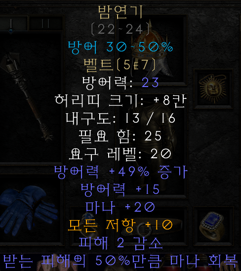 : 받은 피해의 50% 마나회복 옵션이 매우 좋고, 모든 저항 옵션까지 있어서, 원소술사, 해머딘, 강령술사들의 인기 아이템이다.