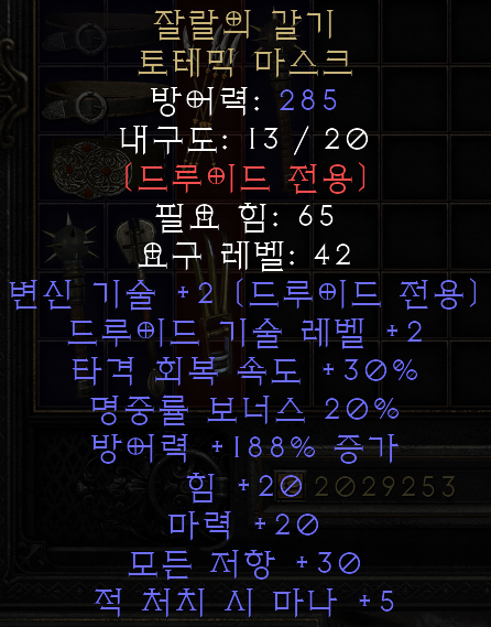 잘랄의 갈기 토테믹 마스크 방어력: 247~297 내구도: 20 (드루이드 전용) 필요 힘: 65 요구 레벨: 42 변신 기술 +2 (드루이드 전용) 드루이드 기술 레벨 +2 타격 회복 속도 +30% 명중률 보너스 20% 방어력 +150~200% 증가(변동) 힘 +20 마력 +20 모든 저항 +30 적 처치 시 마나 +5 |