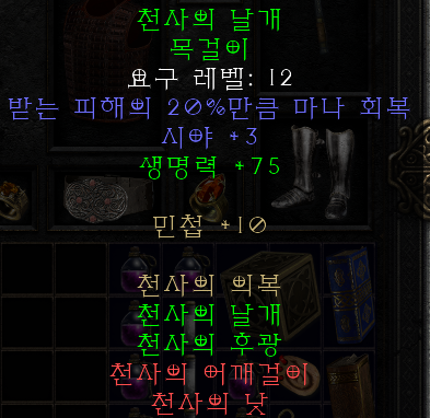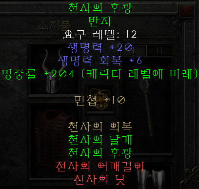 천사의 후광 엔젤릭 헤일로우 반지 요구 레벨: 12 생명력 +20 생명력 회복 +6 명중률 +144~1188 (2 세트) 마법아이템발견확률 50% 증가 (3 세트) |