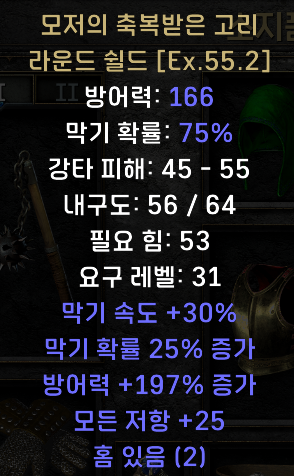 모저의 축복받은 고리 라운드 쉴드 ![]() 막기 확률 : 67%(성기사), 62%(야만용사/아마존/암살자), 57%(드루이드/강령술사/원소술사) 성기사 강타 피해: 7 - 14 내구도: 64 필요 힘: 53 요구 레벨: 31 막기 속도 +30% 막기 확률 25% 증가 방어력 +180~220% 증가(변동) 모든 저항 +25 홈 있음 (2) |