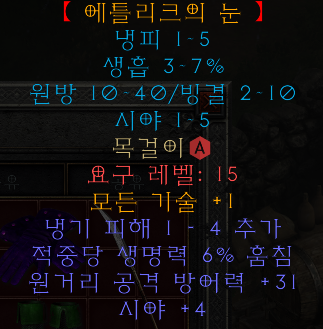에틀리크의 눈 목걸이 ![]() 요구 레벨: 15 모든 기술 +1 냉기 피해 (1~5) 추가 적중당 생명력 3~7% 훔침(변동) 원거리 공격 방어력 +10~40 (변동) 시야 +1~5 (변동) |