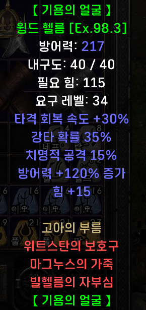 : 보통 투구에는 잘 없는 강타와 치명타, 타격회복속도가 모두 있어서 물리딜 케릭에게는 매우 좋은 옵션들이다.