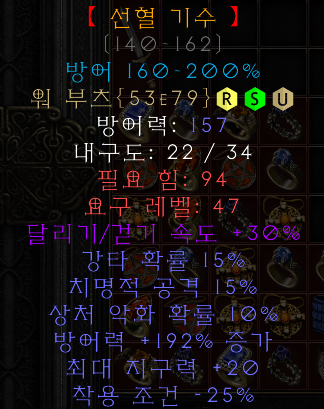 선혈 기수 워 부츠 ![]() 방어력: 140~162 암살자 발차기 피해: 39 - 80 내구도: 34 필요 힘: 94 요구 레벨: 47 달리기/걷기 속도 +30% 강타 확률 15% 치명적 공격 15% 상처 악화 확률 10% 방어력 +160~200% 증가(변동) 최대 지구력 +20 착용 조건 -25% |