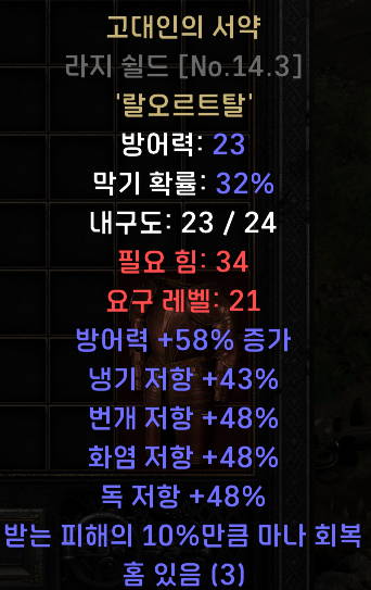 라주크 소켓퀘를 하고, 강철무기를 들고있다면, 바바리안 구출퀘스트 보상으로 받은 랄룬, 오르트룬, 탈룬으로 고대인의 서약 방패를 만들어 착용합니다. 저항이 많이 붙어있어서 만드는것을 추천합니다.