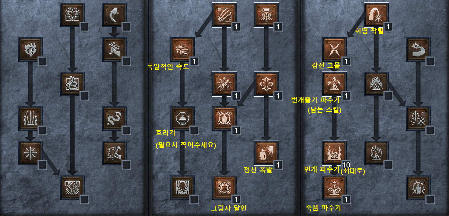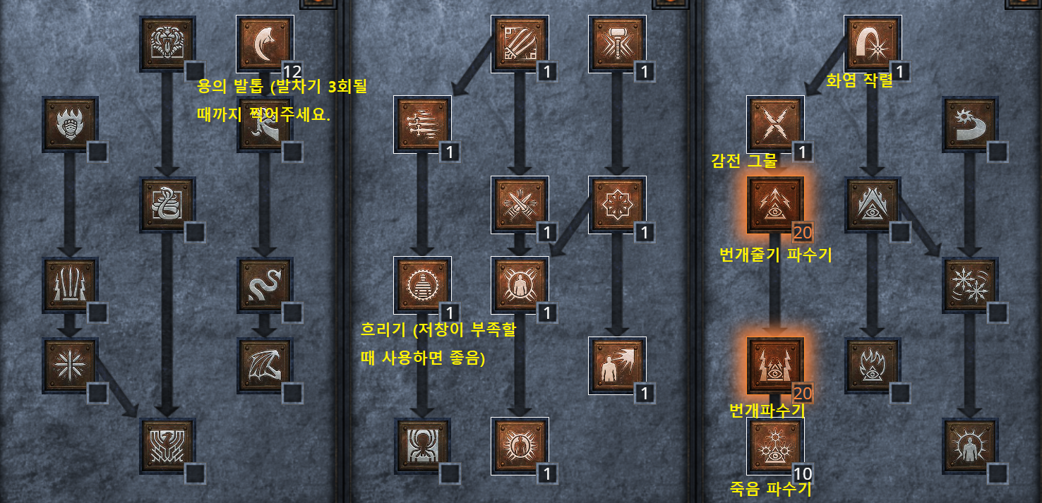 : 스킬은 번개 파수기 마스터 - 죽음 파수기 (순수10개) -번개줄기파수기 마스터 순으로 찍어줍니다. 그 후에는 화염 작렬을 찍어줍니다. (죽음파수기 10개를 찍는 이유는 시폭범위가 적당하다고 느낄정도인 10포인트 투자)