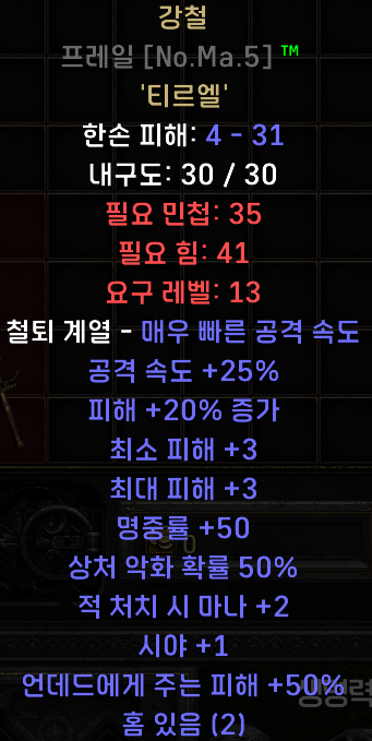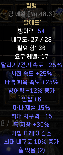 - 잠행(2소켓 갑옷+탈+에드) / 잎새(2소켓 스태프 +티르+랄) / 강철(2소켓 칼,도끼,메이스 +티르+엘)