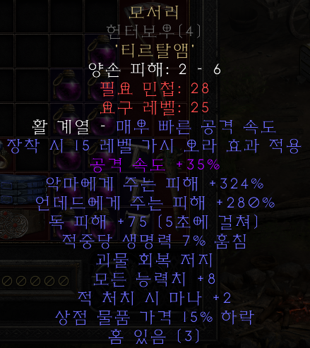 맨땅 활아마에게 매우 유용한 35% 공격속도 증가 옵션과 언데드와 악마에 주는 피해증가가 매우 높게 붙어 있습니다.