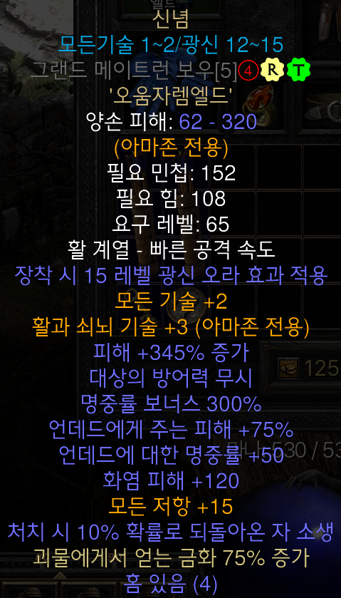 < 재료인 4소켓 활의 종류와 공속 > - 그랜드 메이트런 보우 : 아마존 전용활 (활과 쇠뇌 최대 +3 가능.) 기본 활 데미지가 가장 높은 베이스. 공격 속도 95%이상을 맞춰야 7프레임. (장갑20+목걸이20+벨트10+투구45) 결국 목걸이는 대군주 / 벨트는 뱀팡벨트가 강제되며, 마비나투구에 15공속 주얼을 넣어 45공속을 맞추거나, 매직 3소켓 30달려가 있는 투구에 15공속 주얼 3개를 넣어 사용한다. 갑옷에 45 공속이 있는 배신을 입을수도 있지만, 인내 나 수수를 포기하기는 힘든부분이 있다. 2.6 신규 룬어인 투지활을 스왑용으로 사용해, 1레벨 폭발적인 속도 버프를 터트리면 12-13광신 신념은 50공속 14-15광신 신념은 45 공속만 맞추면 7프레임을 뽑을 수 있다. 다만 무기를 스왑해 번갈아 사용하기가 다소 귀찮을 수 있다. (관련 영상 설명 링크) *1레벨 폭발적인 속도 지속시간은 120초이며, 공속과 이속을 올려준다. 발동시 발아래 하얀 원이 생긴다. - 메이트리어컬 보우(메추리) : 아마존 전용활 (활과 쇠뇌 최대 +3 가능.) 공격 속도 45%이상이면 7프레임. (115% 맞추면 6프레임) 요구 공속이 낮아서 아트마 목걸이나 서슬꼬리 벨트 등을 착용 할 수 있다. 다만, 자체 기본 피해가 낮은것이 단점. - 쉐도우 보우 : 공격 속도 65% 이상이면 7프레임 확보가능. 전용활이 아니라서 스킬이 안붙음. 메추리보다 기본 피해가 높음. - 그레이트 보우 : 주로 용병용 활로 쓰인다. (2.4 패치로 용병도 아마존 전용활을 들 수 있게되었습니다. 또한 스킬보너스 효과도 용병에게 적용됩니다. 다만, 용병이 신념을 들게되면, 광신오라의 피해증가 효과가 절반이 됩니다.) * 피해 증가 +15 옵션이 붙은 4소켓 고급 그랜드 메이트런 보우나 메이트리어컬 보우에 작업하면, 딜을 더 높일 수 있다. |