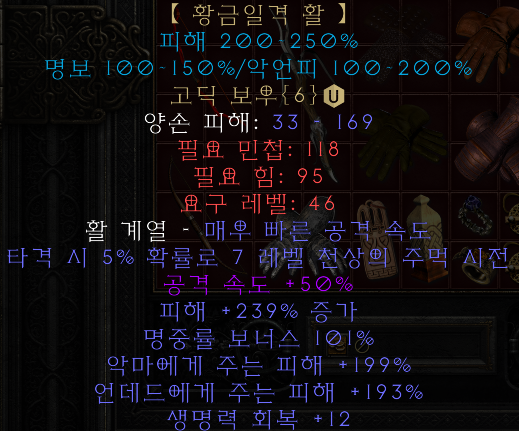 황금일격 활 고딕 보우 ![]() 양손 피해: (30~35) - (150~175) 필요 민첩: 118 필요 힘: 95 요구 레벨: 46 공격 속도: [10] 타격 시 5% 확률로 7 레벨 천상의 주먹 시전 공격 속도 +50% 피해 +200~250% 증가(변동) 명중률 보너스 100~150%(변동) 악마에게 주는 피해 +100~200%(변동) 언데드에게 주는 피해 +100~200%(변동) 생명력 회복 +12 |